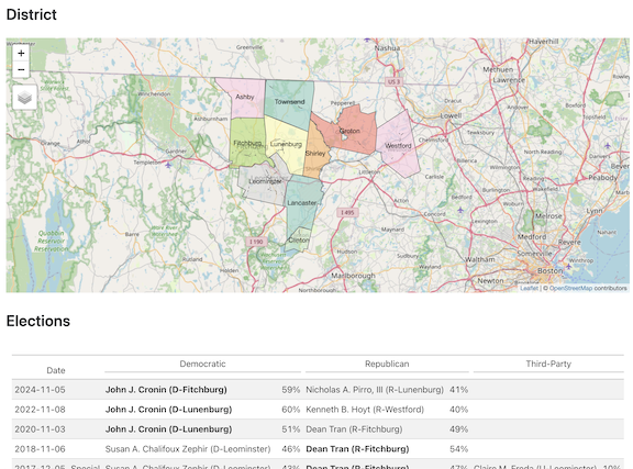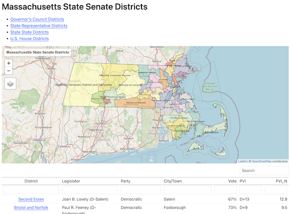 There is also a separate page for each of the 160 State Representative, 40 State Senate, 9 U.S. House, and 8 Governor’s Council districts with demographic details and electon results back to 1990.